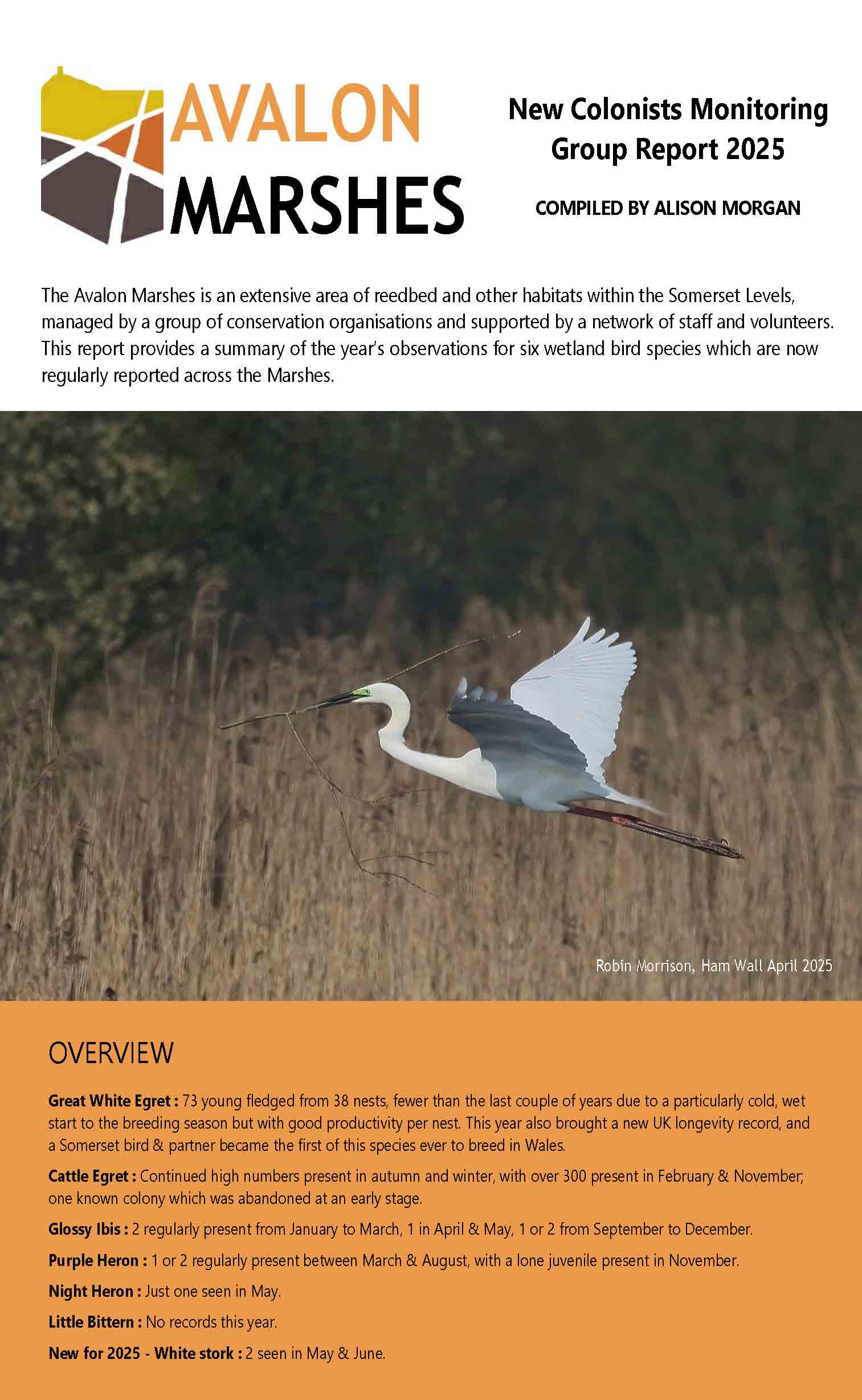 GWE COLOUR RING RESIGHTINGS PIN MAP 2025 Update: 2025 was the 14th consecutive breeding year for the Great White Egret here on the Avalon Marshes, and marked a 10 year milestone for the ringing programme. Every year is different, and 2025 was no exception. Egret AAF set a new national longevity record, and Egret ABM and partner helped create the first ever breeding record in Wales. Here in Somerset the birds battled with a year of erratic and inclement weather, established a new breeding site on Ham Wall and lost an entire colony in a single week to predation on Shapwick Heath. But by the end of the season, 73 birds had fledged from 38 productive nests. This is the third highest total of young fledged, after 2025 and 2024, but nonetheless represents a break in the hitherto uninterrupted sequence of expansion – largely due to the unusually cold weather at the beginning of the breeding season. 14 of this year’s nestlings were given colour rings; all fledged, and 12 have subsequently been resighted. A paper 'Great White Egrets in England - tipping the balance' was published in British Birds in May 2022. Recent annual reports can be downloaded here: For blog posts and other reports: